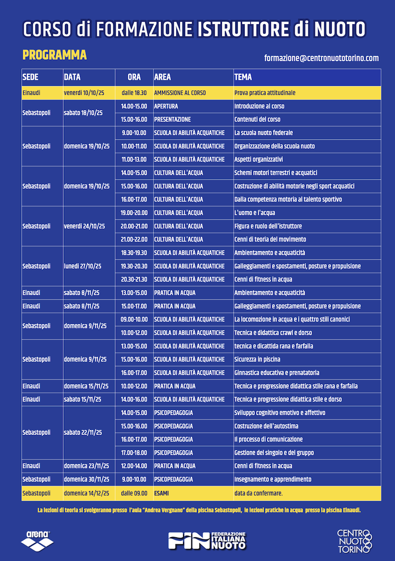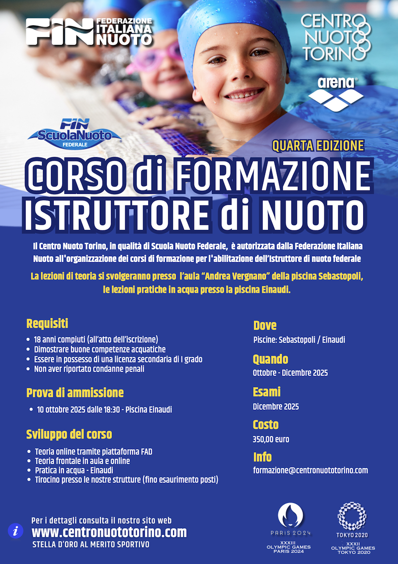 Nell’autunno 2025, con esami entro Natale 2025, si svolgerà la quarta edizione del corso di formazione per l’acquisizione della qualifica federale di Istruttore di Nuoto organizzato dal Centro Nuoto Torino, per ricevere informazione scrivi a a formazione@centronuototorino.com. Seguono alcune informazioni preliminari.